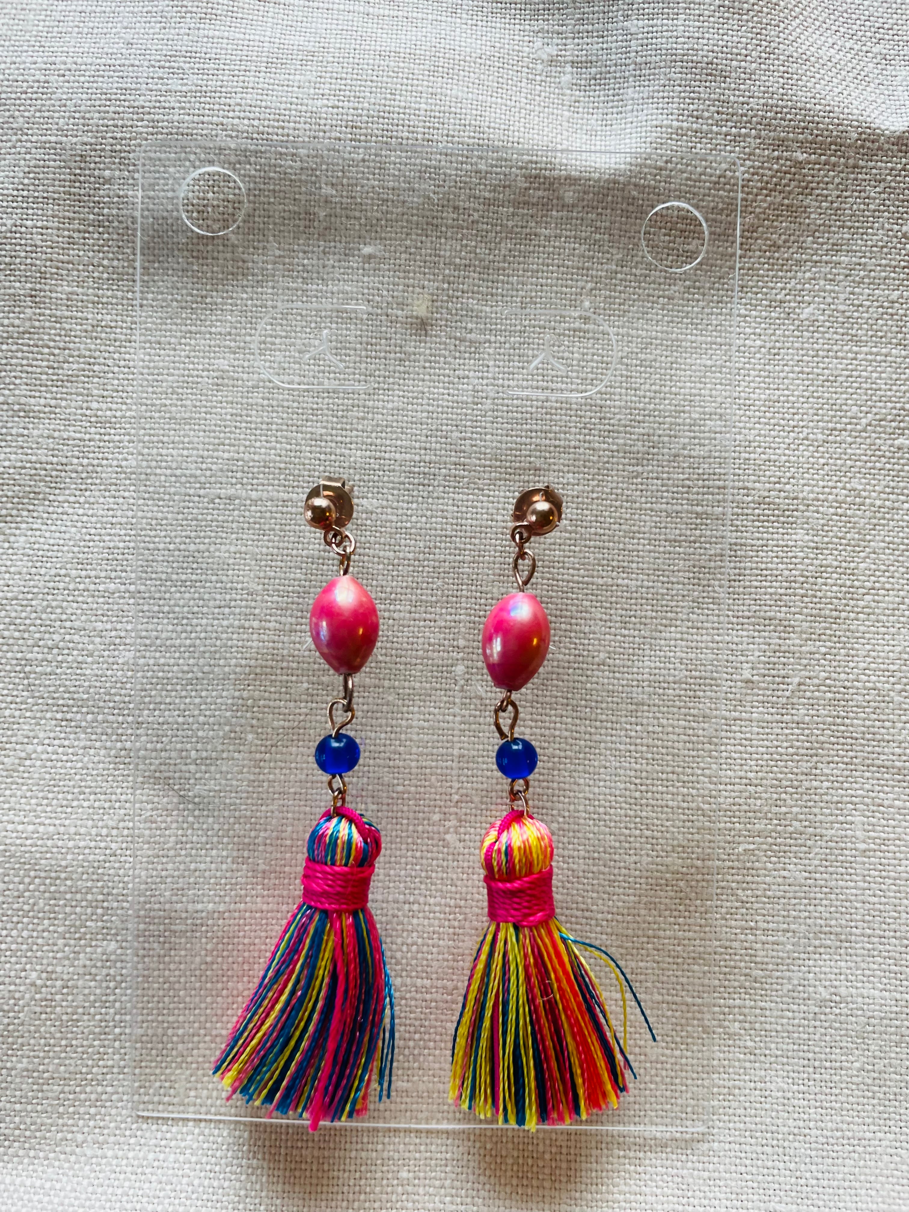 ピンクゴールドの金具とアジアンテイストなビーズとタッセルが目を惹くピアスです。 ピンクゴールドのイヤリングの金具がないため、ピアスからイヤリングへの変更不可です。ご注意下さい。