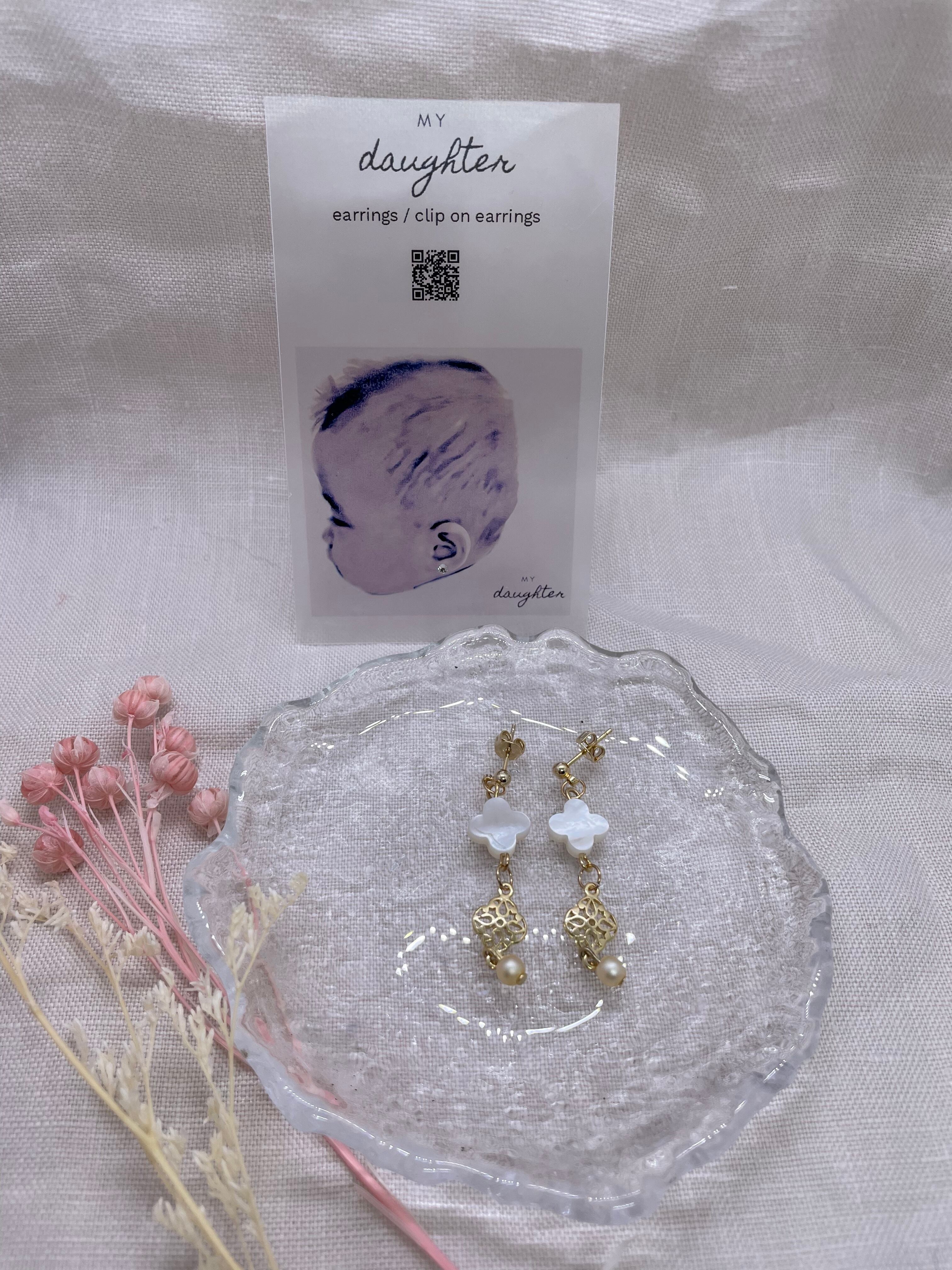 クローバーモチーフのシェルビーズの小ぶりなピアスです。イヤリングへ変更できます。
