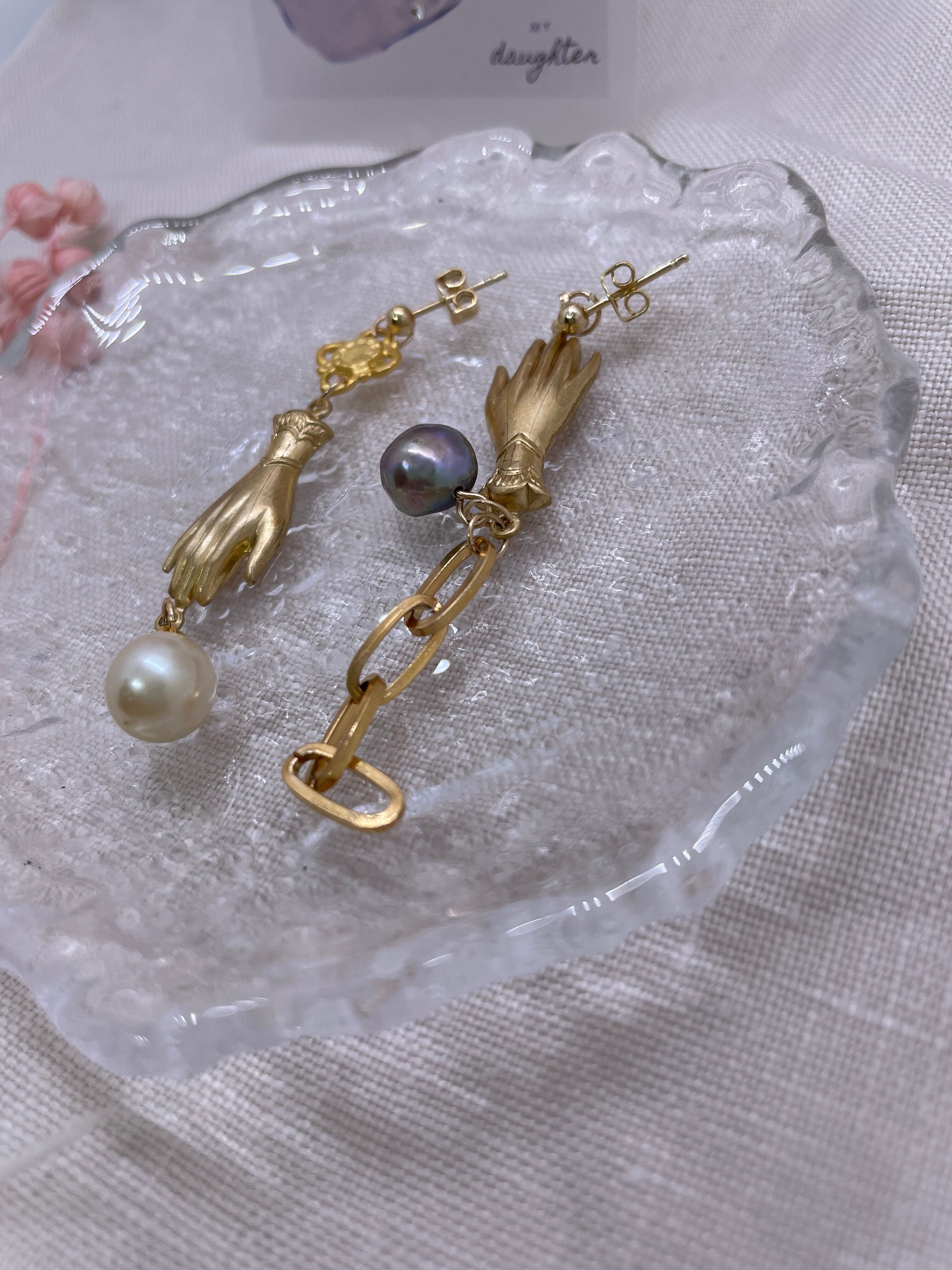 USA真鍮製のハンドモチーフとシェルパール、ガラスパールのピアス(0070)